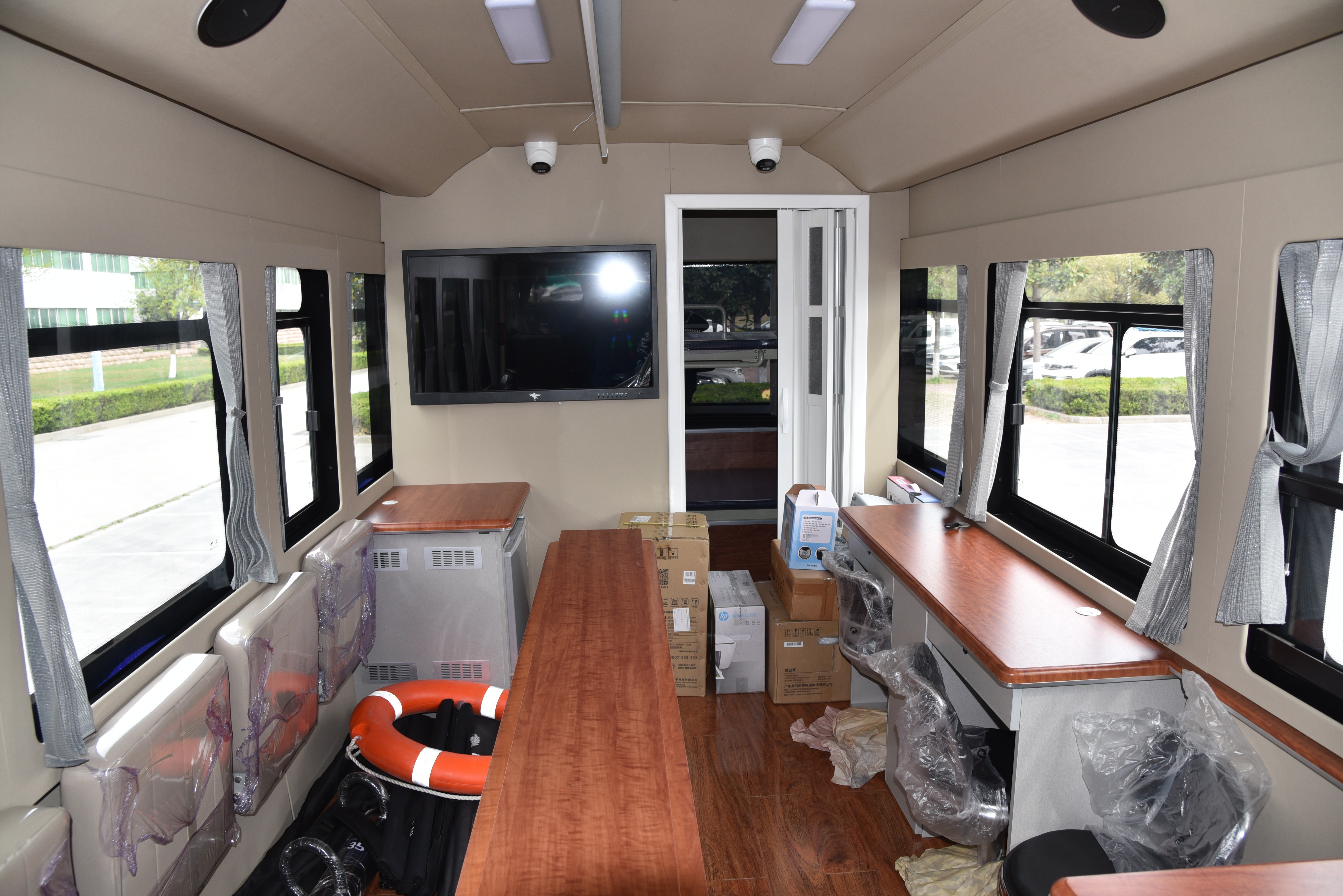 整車分為辦公區(qū)、休息區(qū)、拓展艙區(qū)。辦公區(qū)有智能化警務(wù)辦公指揮系統(tǒng)和智能監(jiān)控系統(tǒng),可遠程調(diào)度指揮。休息區(qū)有上下四個床鋪,中間有儲物柜。拓展艙分為手動、電動兩款,可加大內(nèi)部辦公空間,實現(xiàn)車內(nèi)辦公、遠程視頻會議等功能。