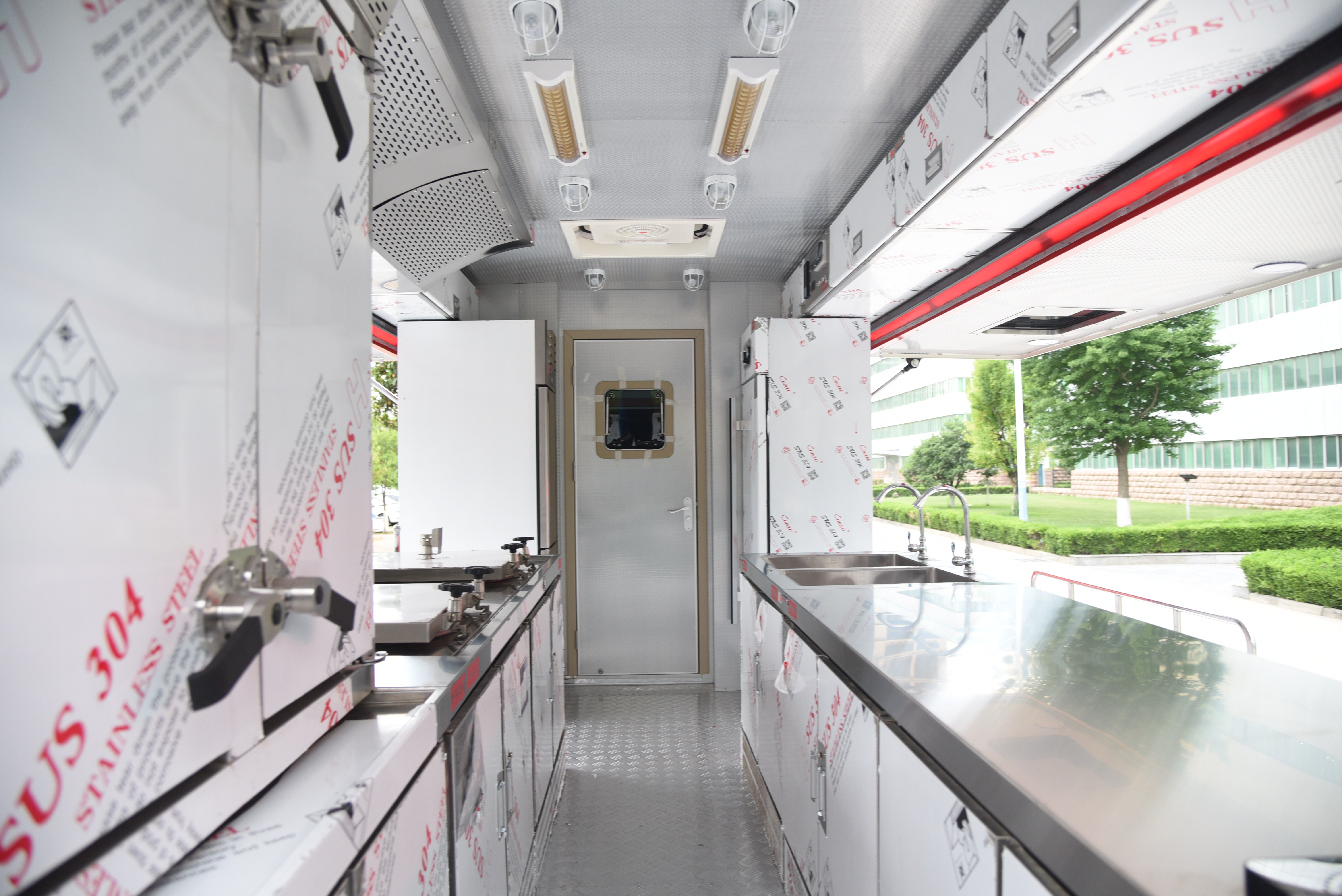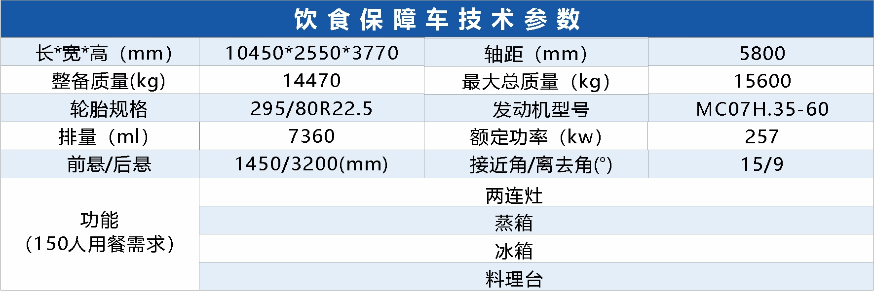 主要裝備有各類炊事設備,滿足50-300人用餐需求,是用于在滅火救援及其他災害事故現場為野外執勤人員制作、加工飲食的作業類專用汽車。